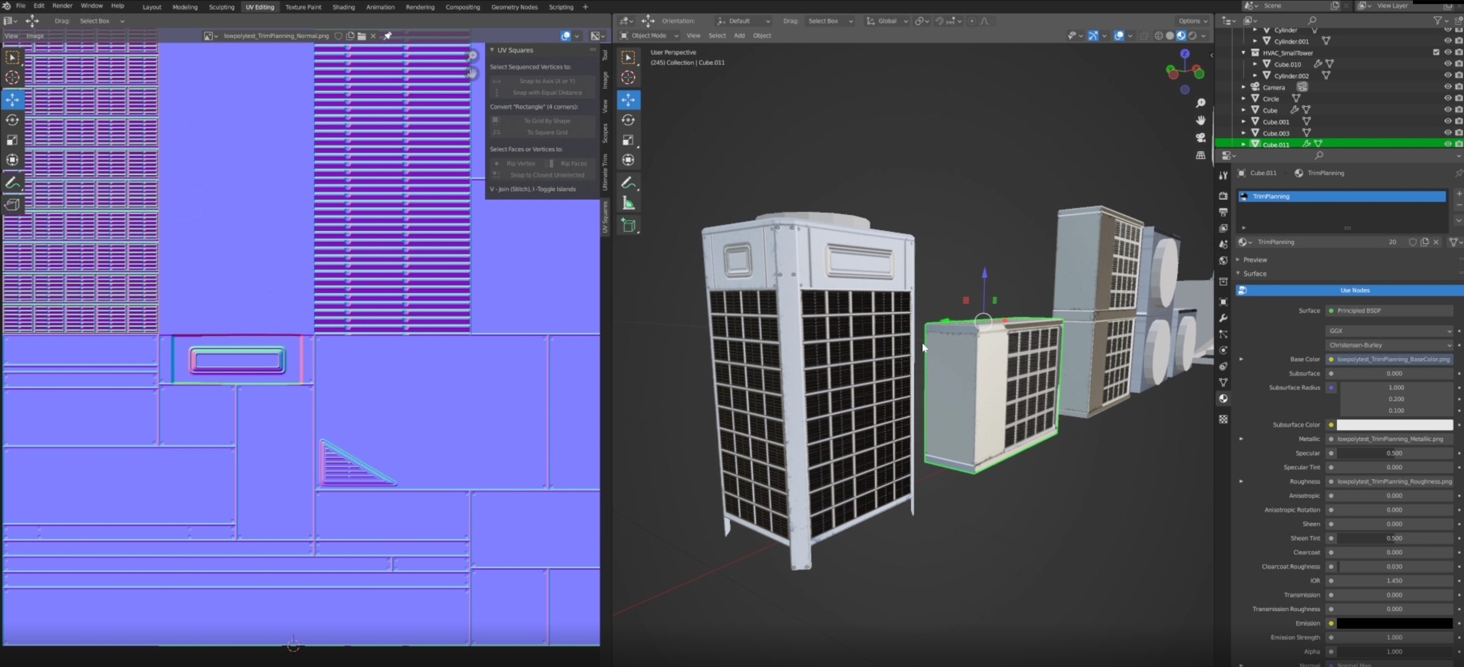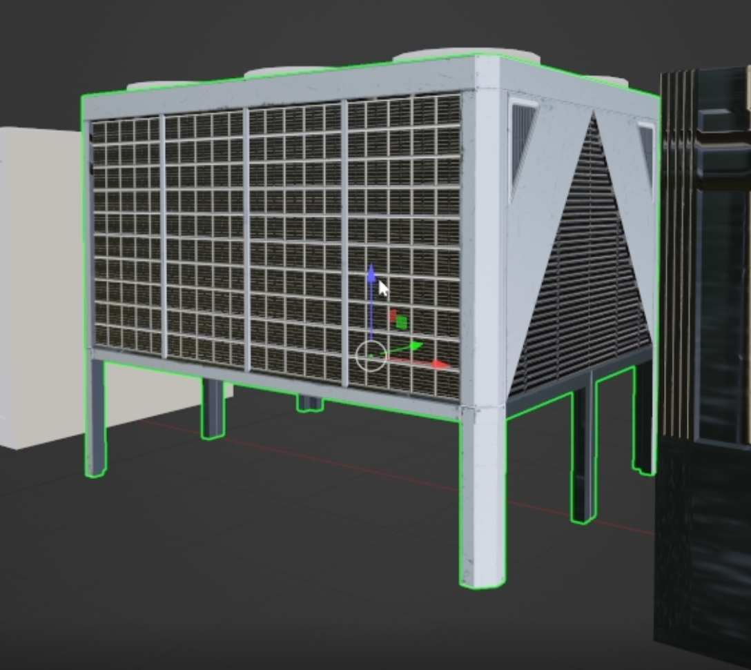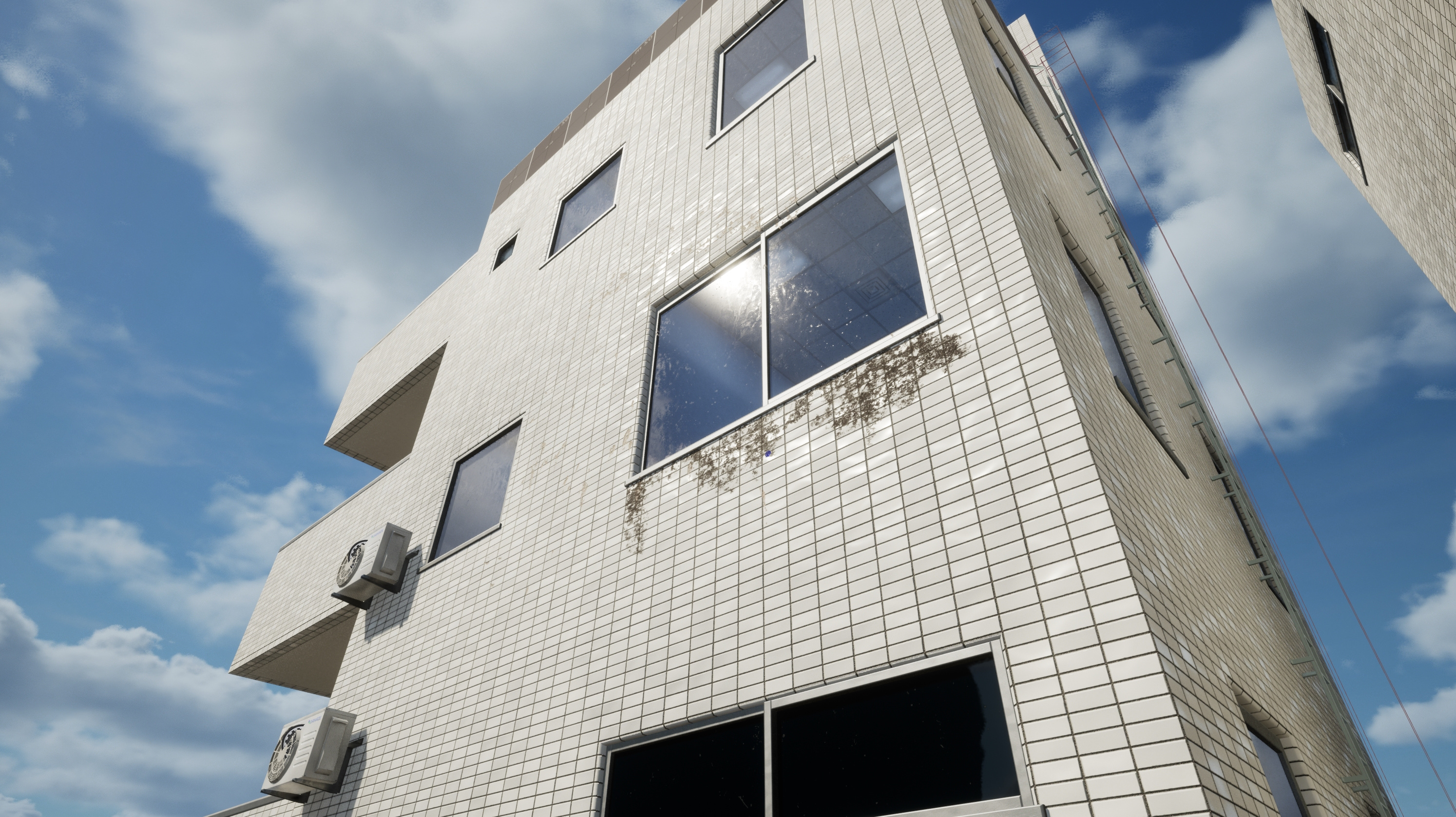 Finally, I made good progress in the art side of things. As mentioned in the introduction, I'm currently in the process of texturing 20 unique AC units with a single 2k texture split in a way to guarantee myself a roughly 512 pixel per meter texel density for the objects, which range from 1 to 3 meters in height. I also made some architectural meshes such as modular building walls with and without windows, and a typical stairwell found on the outside of many Tokyo apartments.
